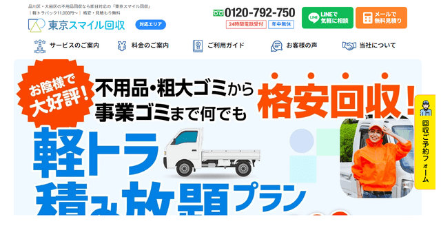 「東京スマイル回収」の強みと言えば、なんと言っても、スピーディーな対応力。東京23区をサービス対象エリアにしており、いずれも最短で即日対応が可能です。公式ホームページによれば、常に緊急対応できるチームが待機しているため、急ぎの場合はすぐに対応してくれます。急遽、不用品を処分したいときでも大助かりです。